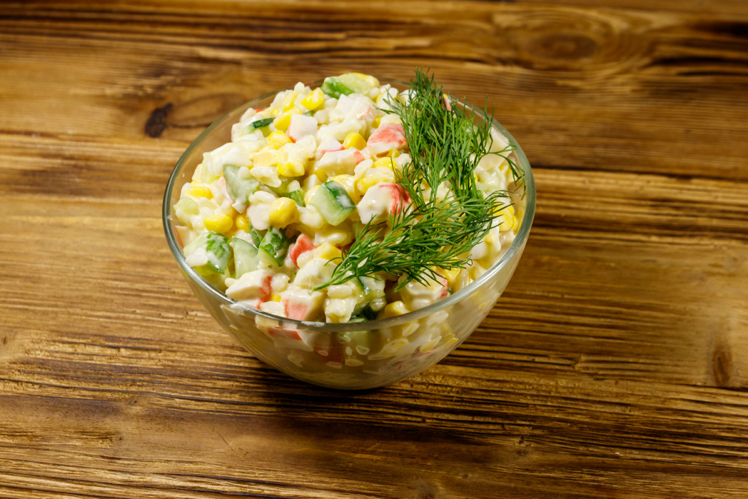 - Крабовые палочки мелко нарезать. Так же нарезать лук, огурец и яйца. Смешать нарезанные ингредиенты с кукурузой и отварным рисом.