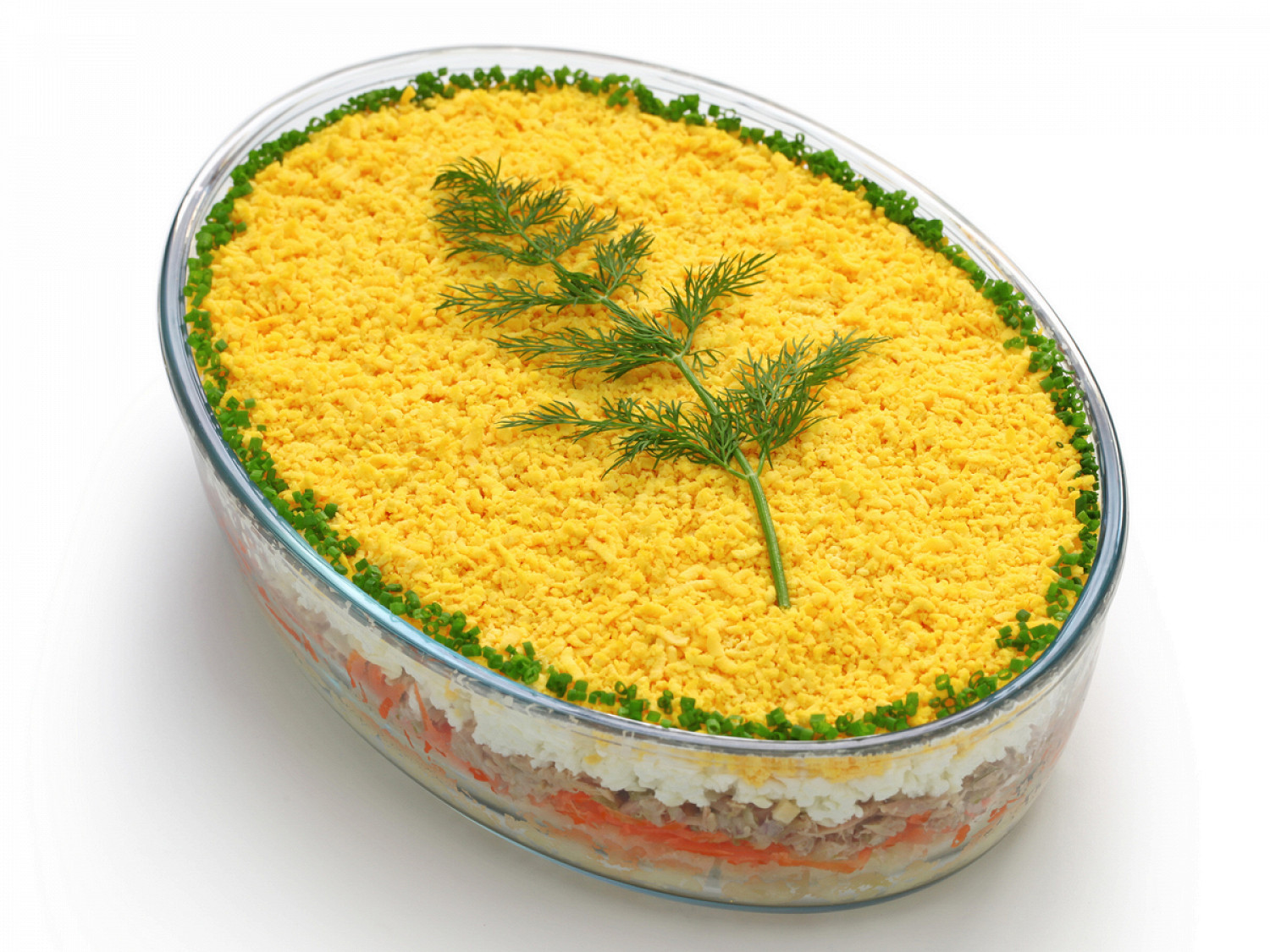 - Лучше убрать блюдо на ночь в холодильник и подавать к столу на следующий день. За это время слои пропитаются, и салат получится более сочным.
