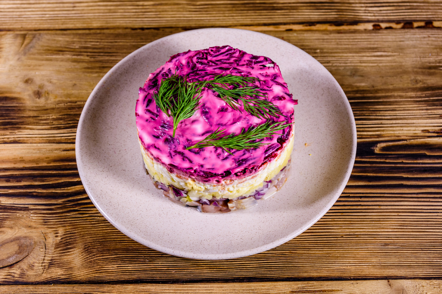 - Последними выложить свеклу, слой майонеза и тертый желток. Убрать салат в холодильник на ночь: так все слои хорошо пропитаются.