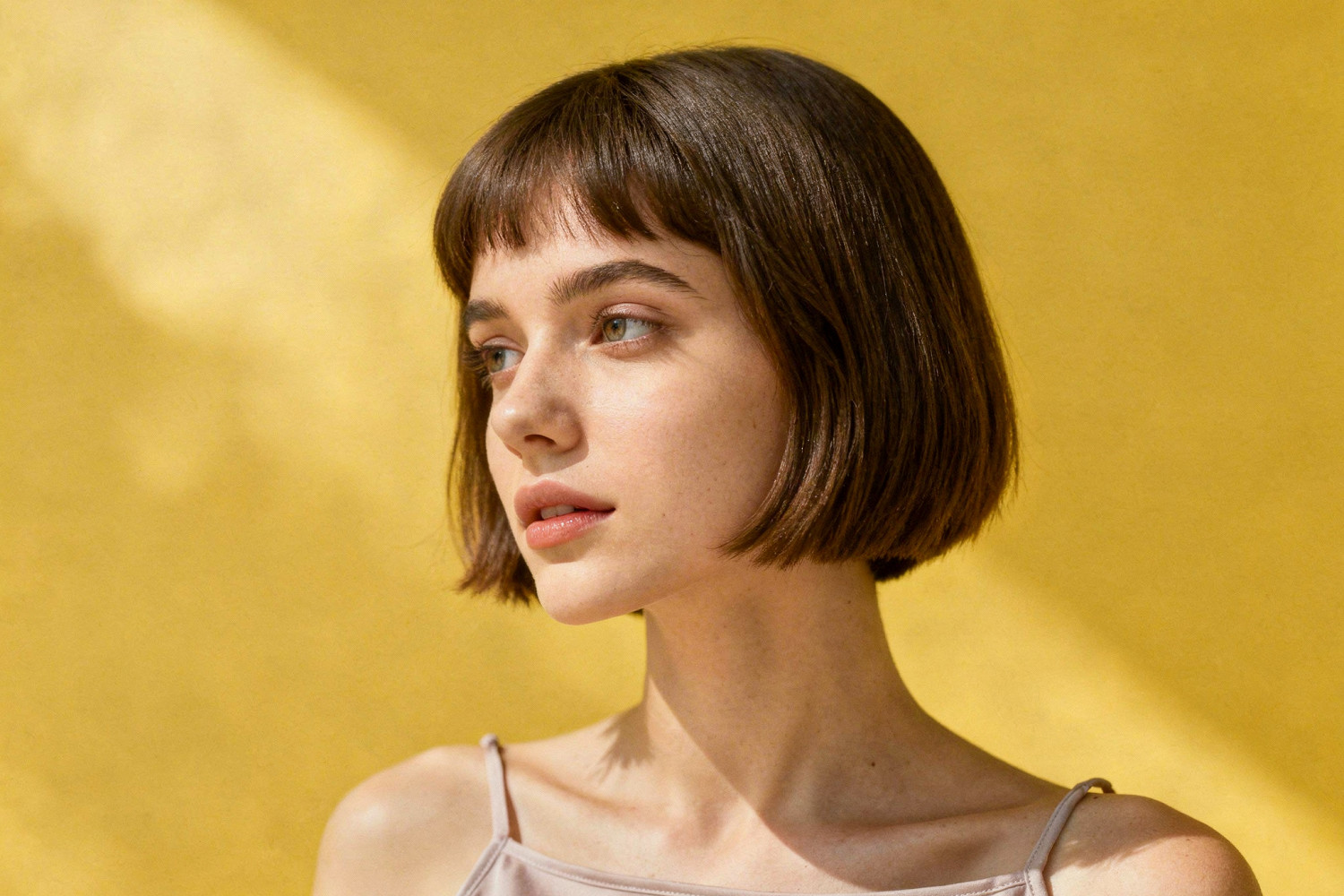 Для вытянутого лица, наоборот, нужно немного сократить длину и добавить объема по бокам. Вам подойдет классическое каре до подбородка или чуть выше. Объемная укладка поможет сделать пропорции более гармоничными. Прямая и густая челка также отлично справится с задачей визуального укорачивания лица.