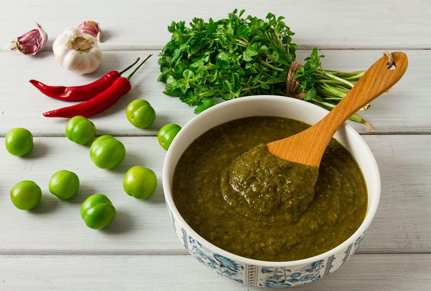 - Соусы. Самый знаменитый — грузинский соус ткемали. Для него берут кислые сорта алычи, чеснок, кинзу, мяту и другие пряности. Идеально подходит к мясу, птице и рыбе.