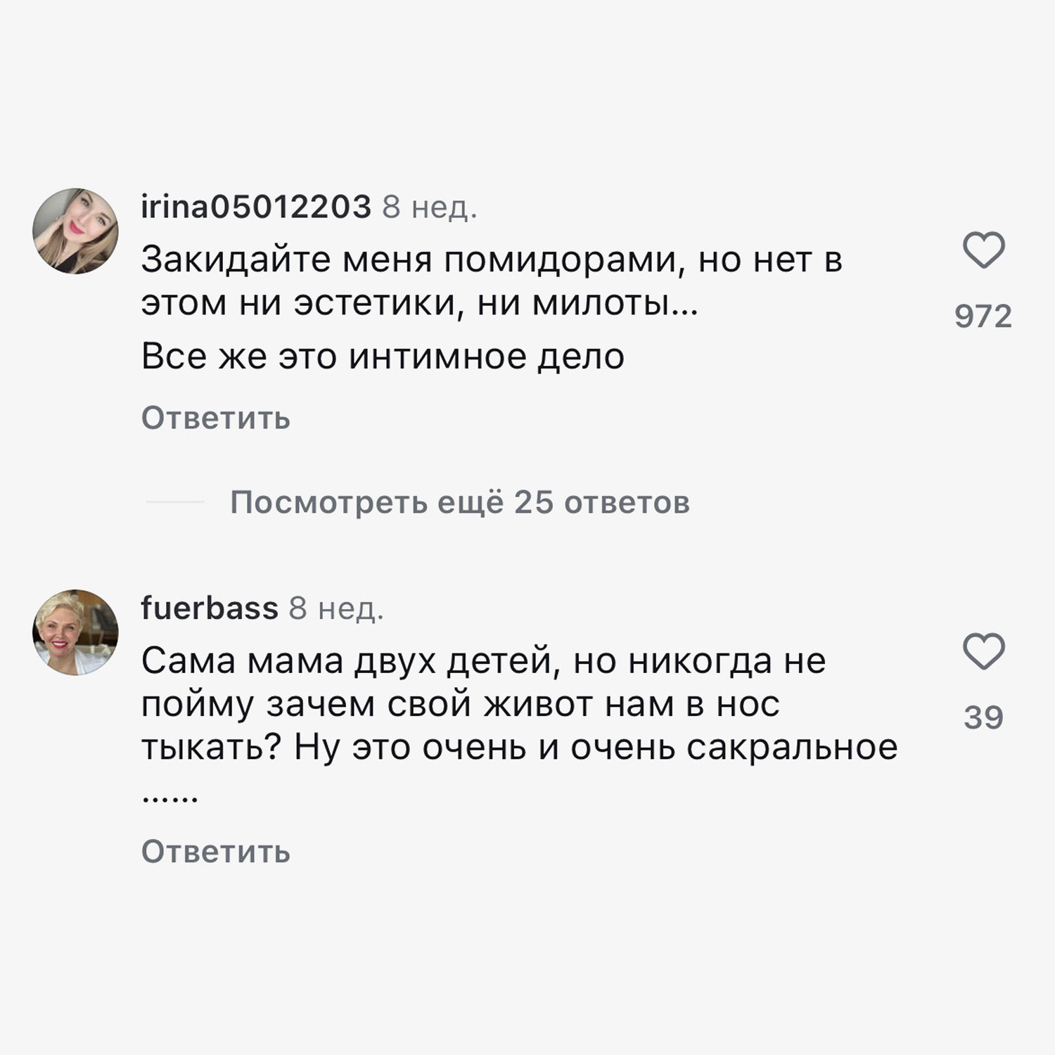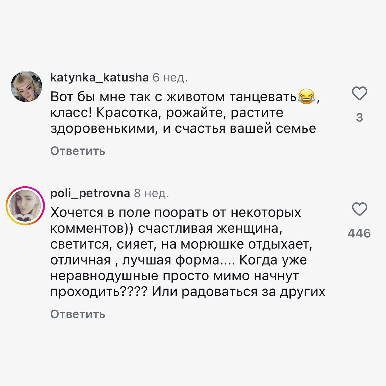 Реакция комментаторов в соцсетях тоже довольно красноречива: особенно достается российским селебрити. В августе подписчики раскритиковали беременную телеведущую Регину Тодоренко за рилс, где она танцует в купальнике. Девушка призналась, что не ожидала такой реакции. «С каких пор милые кривляния, эмоции радости и танцы беременных начали вызывать такую реакцию? Я удивлена, что именно зрелые, умные, опытные женщины (50+) с осуждением отреагировали на озорство. Вот дела. Женщине нужна женщина! Особенно когда она в хрупком, порой уязвимом состоянии», — прокомментировала Тодоренко.
