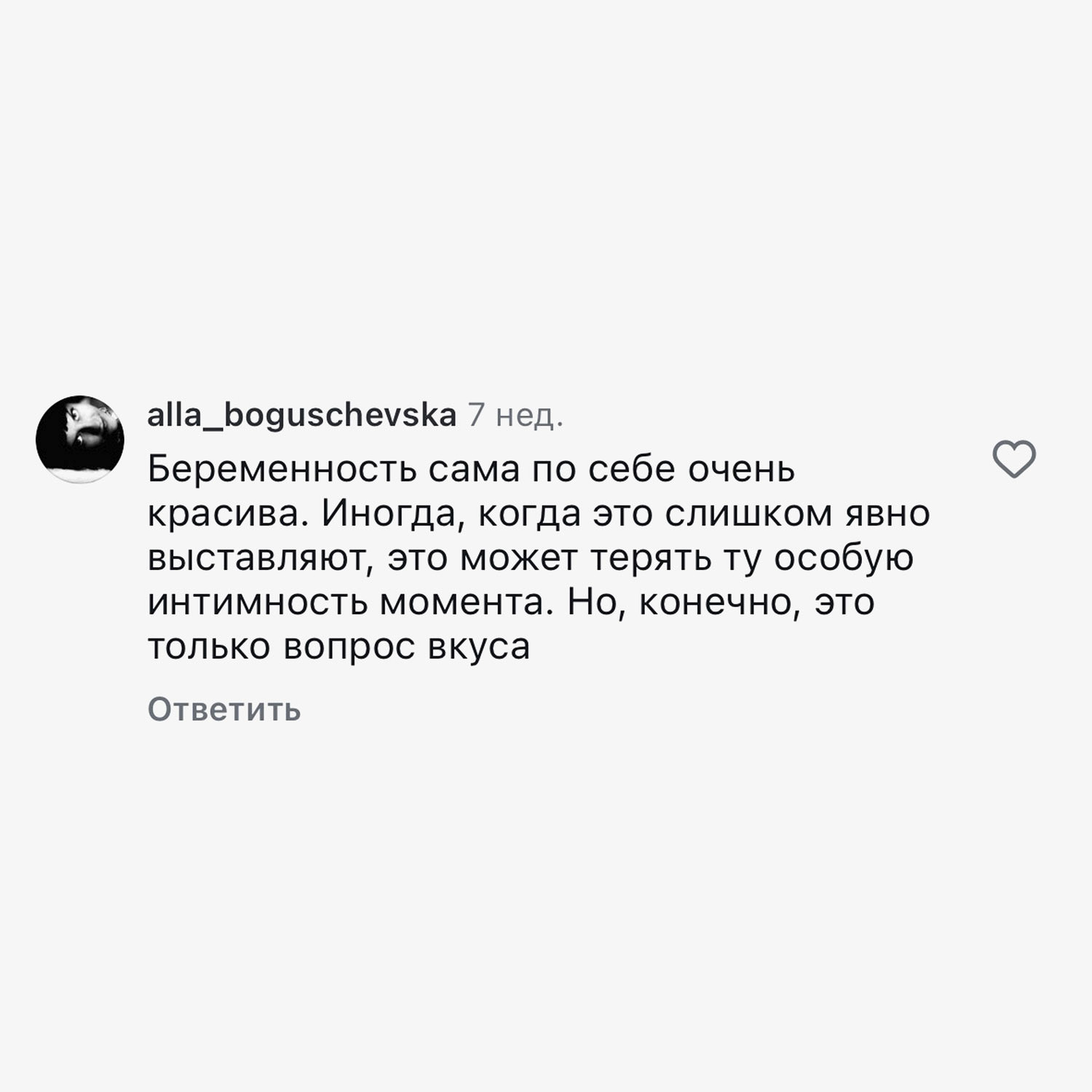 По словам девушки, комментарий незнакомой женщины о ее внешнем виде был далеко не первый и не последний за всю беременность. Но единственный, который удалось заснять на камеру. Как только живот стал заметным, Екатерина оказалась под пристальным вниманием окружающих — особенно в дни, когда выходила в чем-то «оголяющем». «Сейчас это уже привычное дело получить пару-тройку „приятностей“. Мое любимое: „позорище“, „мы тут порно снимаем?“, „ты же будущая мать, как не стыдно?“ и, конечно же, „прикрой ребенка“. Выходя из дома с открытым животом, всегда слышу что‑то из этой серии. Ну, правда, если мужа нет рядом», — комментировала Екатерина в 2024 году.