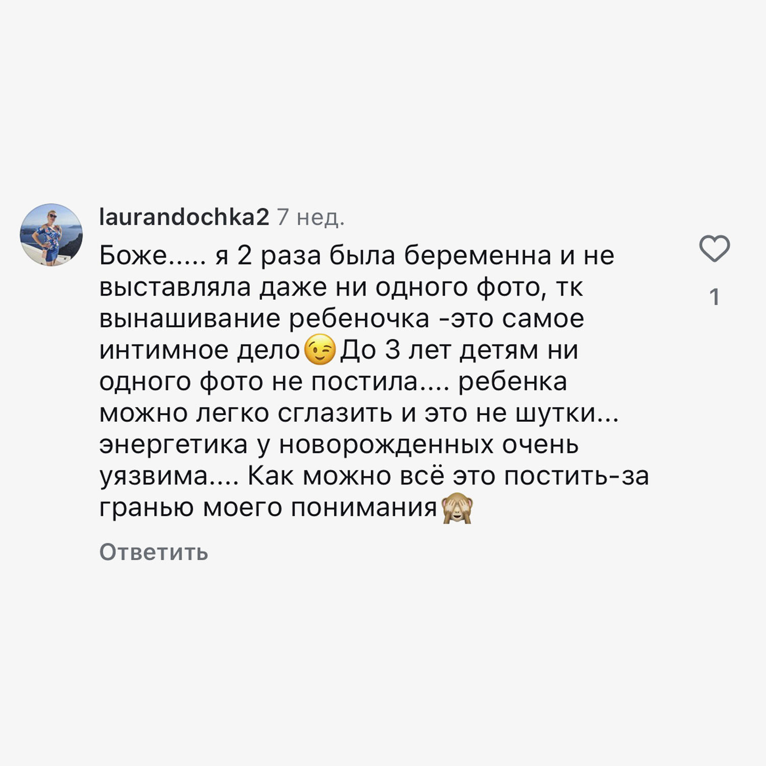 Пять лет назад с подобным столкнулась и беременная певица Наталья Подольская, выложившая в сеть фотографию с отдыха в Турции. «Я редко возмущаюсь, но что ж за менталитет у нас? Я надеюсь, на море беременным в купальнике можно находиться? Или вообще все нельзя? Люди! Я не верю в сглаз! Я верю совсем в другие вещи!» — ответила тогда певица.