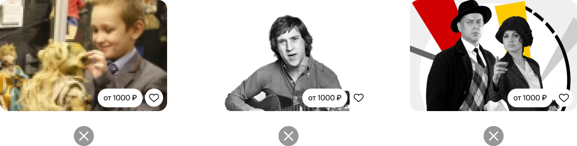 Не используйте изображения с афиш и промо, напрямую не касающиеся конкретной постановки. Лучше использовать фото постановки